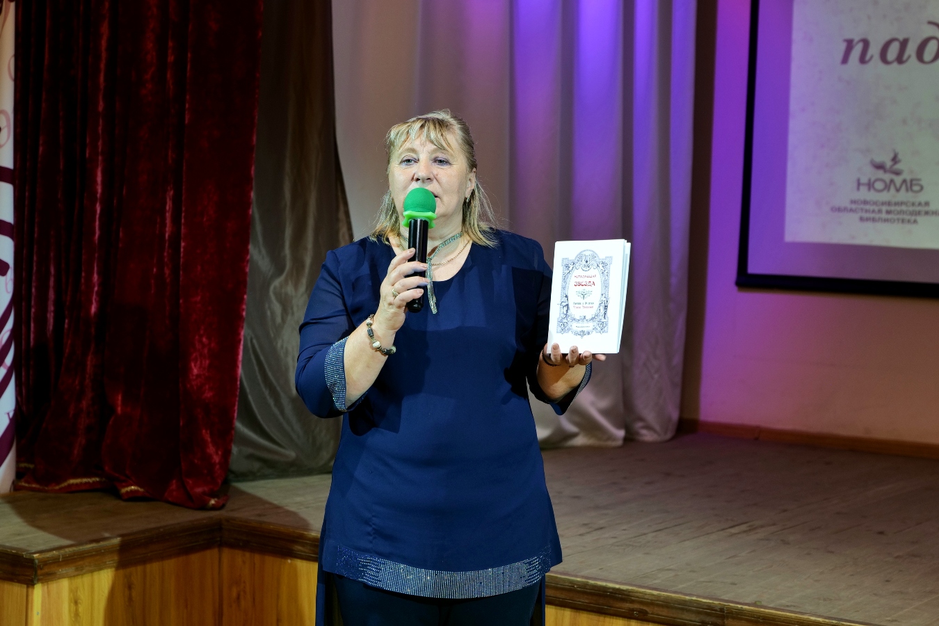 Руководитель отдела литературных программ Областной молодёжной библиотеки Татьяна Синицына показывает сборник «Непадающая звезда»