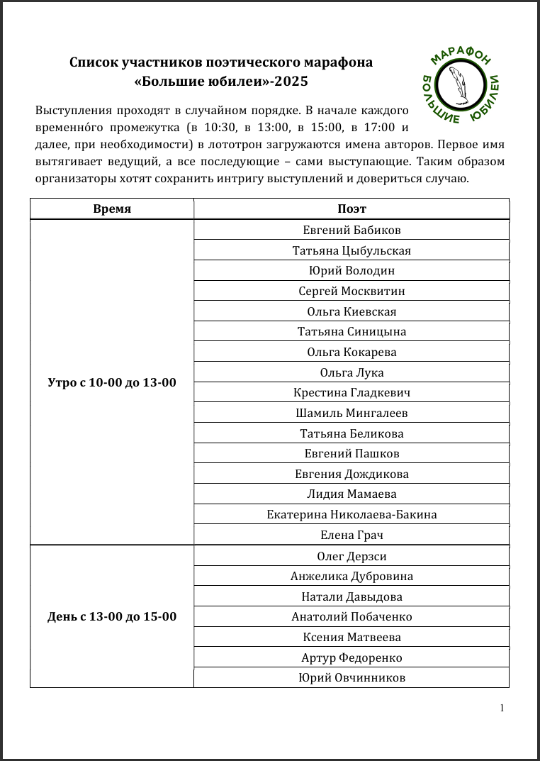 Также в этом году «марафонцы» вспоминают о заслуженных новосибирских поэтах, которые могли бы отметить свои юбилеи: Илье Фонякове (90 лет со дня рождения), Владимире Ярцеве и Евгении Мартышеве (по 80 лет), Владимире Губе (70 лет).