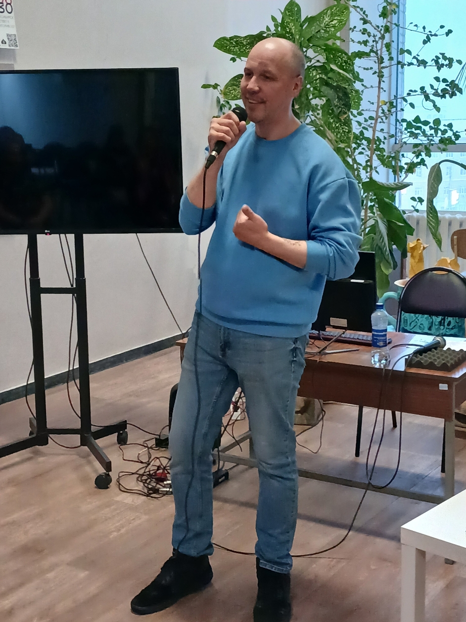 В начале Алексей Грачёв сказал небольшое вступительное слово о клубе и поэтическом сборнике «Новая Атмосфера-2025».