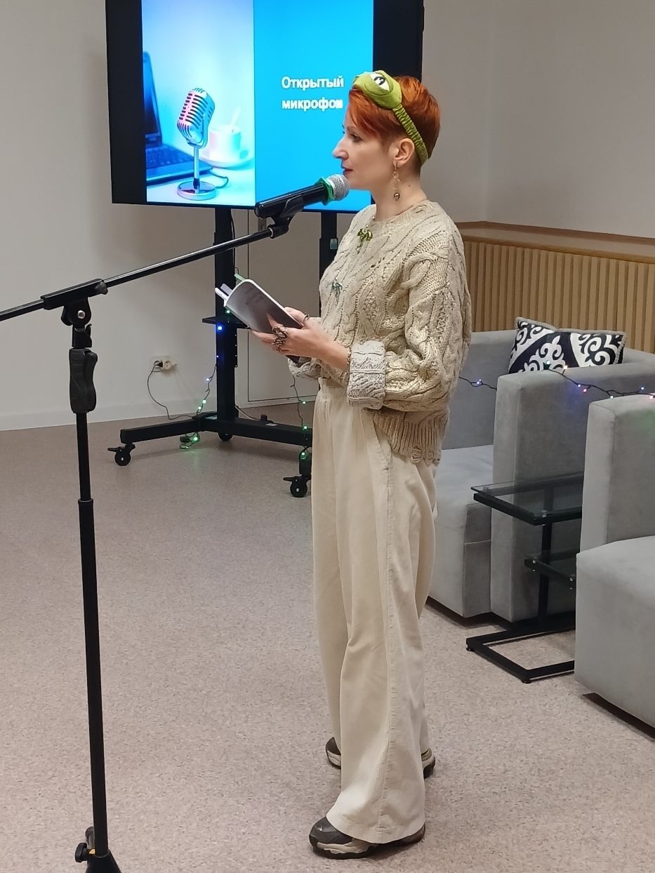 А во второй части был открытый микрофон. Каждый участник придумал себе творческий псевдоним, по которому его и вызывали на сцену. Вызванный поэт выходил и читал первое стихотворение в маске. Затем он снимал маску, называл свое настоящее имя и продолжал читать стихи уже с открытым лицом. Один за другим поэты выходили участвовать в этом потоке освобождения и раскрытия, делились своими произведениями со всеми присутствующими.