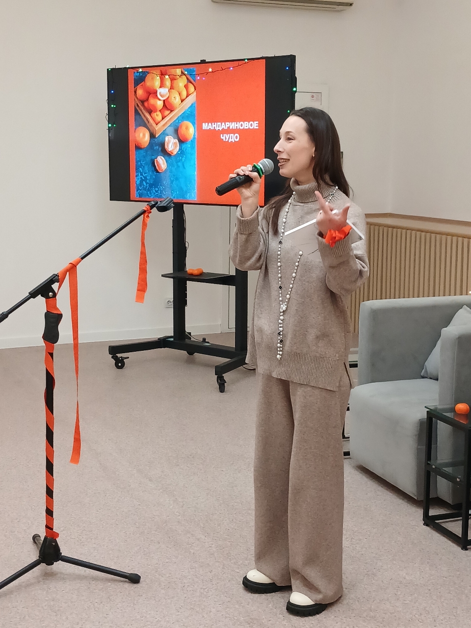 Пока гости собирались, Алексей Грачёв спел несколько песен, несущих высокий радостный настрой. А Татьяна Сергеева и Ольга Лещенко встречали прибывающих участников и вручали им оранжевые галстуки как атрибут мандаринового настроения.