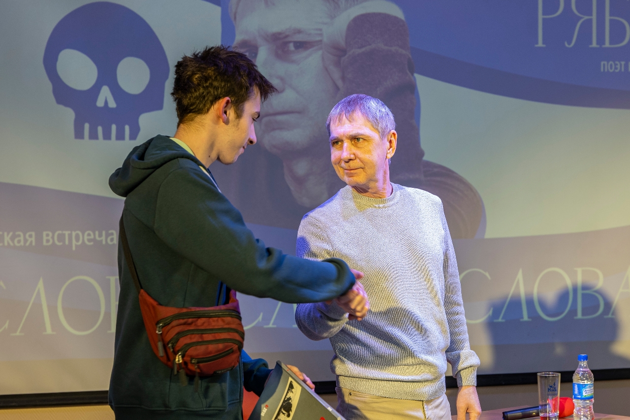 Ребята интересовались, где можно прочитать стихи Дмитрия Рябова, на что поэт ответил, что напечатанные книги уже канули в Лету. Организаторы встречи выразили надежду, что выйдет новый сборник стихов Дмитрия Геннадьевича и предложили автору устроить поэтический вечер теперь уже для взрослой аудитории.