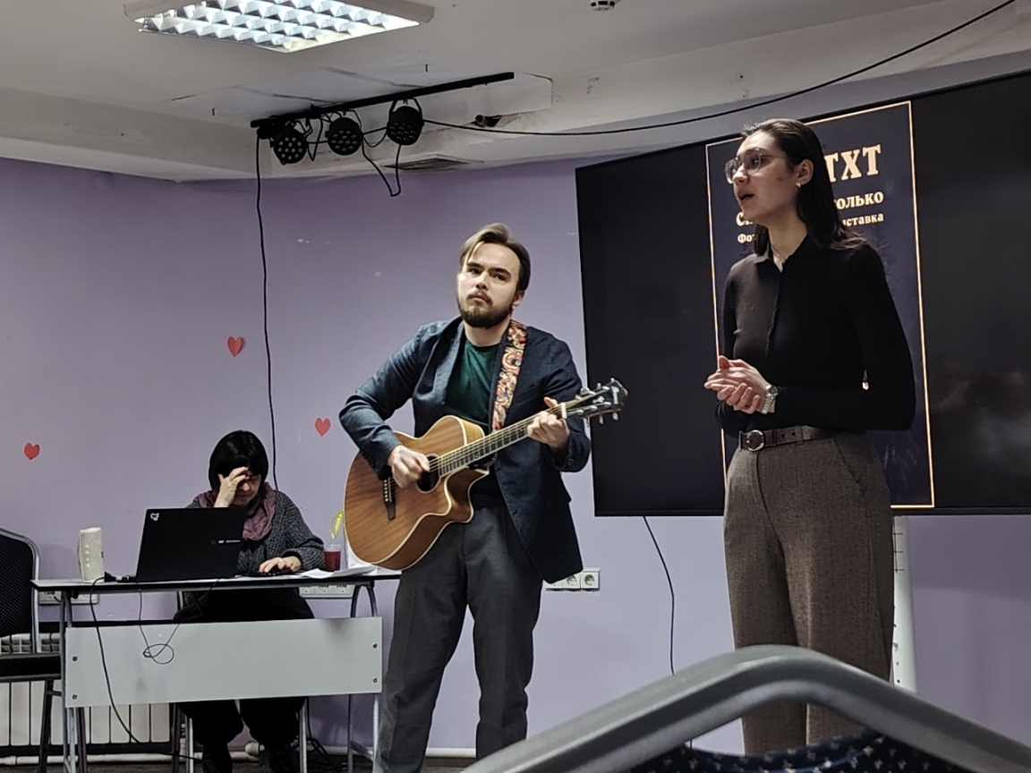 Затем состоялся музыкально-поэтический концерт. Поэты Анна Зорина, Кристина Кармалита и Антон Агейков читали стихи, музыканты Настя Давыдова, Элина Суркова, Виктор Ложников и Антон Зоркальцев пели песни, а с видео экрана вещали те, кто из-за обширности сибирской географии не смог прийти на открытие: Елена Лисовиченко, Андрей Назаров, Аня Пронкевич и Юрий Якобсон.