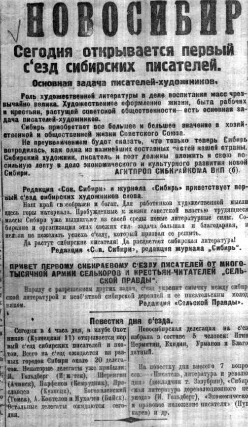— 29 января 1930 года на II съезде Сибирский союз писателей был реорганизован в Сибирское отделение Всероссийского союза советских писателей на правах автономного филиала.