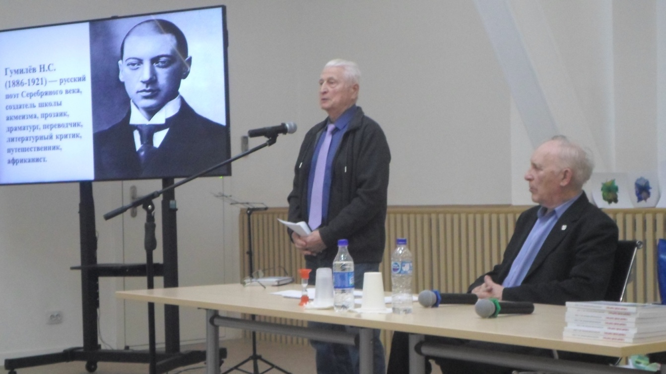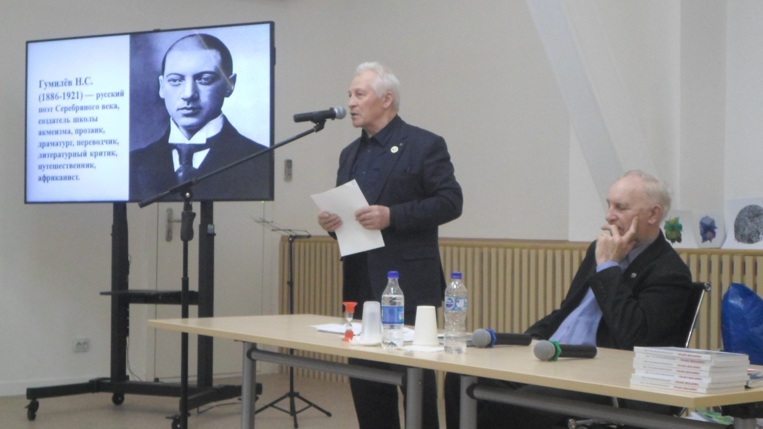 Во второй части встречи говорили о Николае Гумилёве, 140 лет со дня рождения которого исполняется в этом году. Его стихи прозвучали в исполнении Юрия Книженцева и Алексея Льдокова.