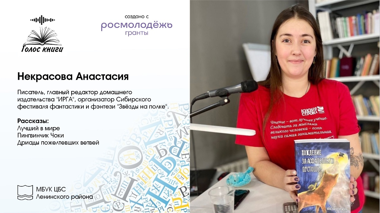 Новый очерк Информационного центра по краеведению библиотеки им. Некрасова рассказывает об одном из молодых сибирских авторов, пишущем фантастику и издающемся в собственном домашнем издательстве. Речь идёт о лингвисте, литературном активисте и организаторе первого сибирского фестиваля фантастики и фэнтези «Звёзды на полке» Анастасии Некрасовой.